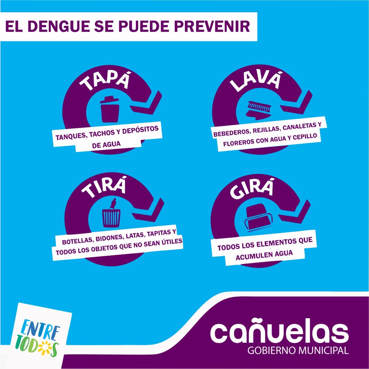 Es fundamental eliminar los posibles criaderos quitando de la vivienda todo recipiente que pueda juntar agua (tapas, botellas. bolsas, latas, cubiertas). También es importante tapar los tanques de agua, mantener los elementos útiles en desuso boca abajo (baldes, tachos), limpiar diariamente los bebederos de animales (vaciarlos, cepillarlos y volverlos a llenar), y mantener patios y terrenos libres de malezas.